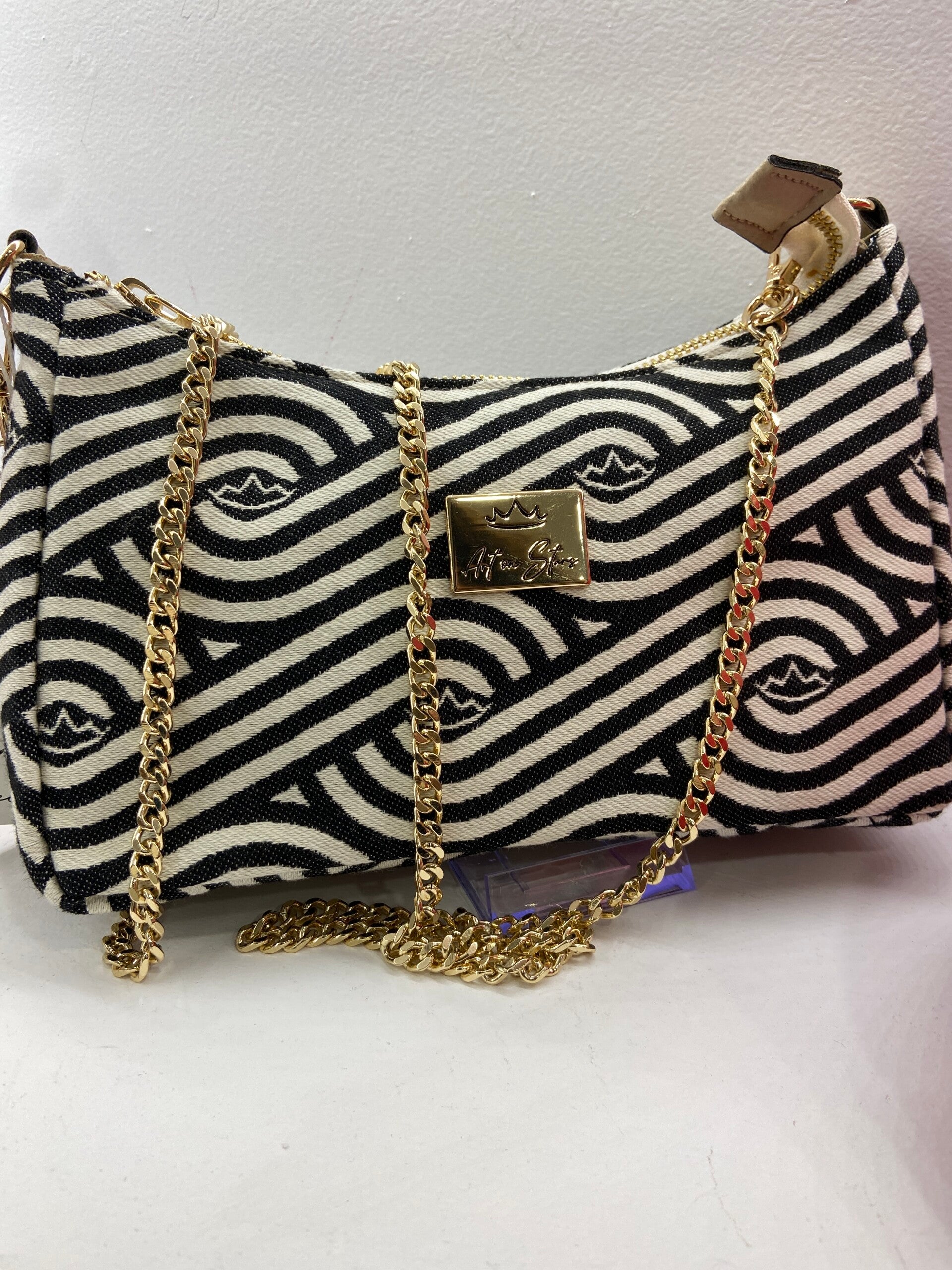 Τσάντα ώμου με αλυσίδα χειροποίητη 100 τοις 100 βαμβάκι Μπες χρώμα με μαύρα σχέδια